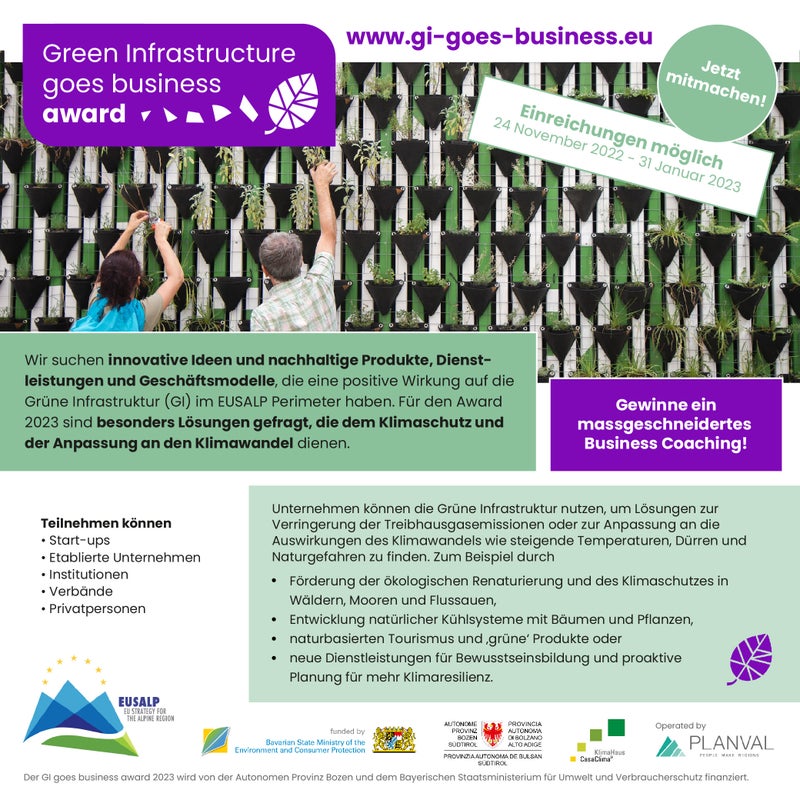 Die zweite Auflage des Green Infrastructure goes business awards wird vom Land Südtirol und dem Bayerischen Staatsministerium für Umwelt und Verbraucherschutz finanziert und mit der inhaltlichen Zuarbeit der Aktionsgruppe 7 (Grüne Infrastruktur) sowie mit Unterstützung der Aktionsgruppe 9 (Energie) der Eusalp umgesetzt. Der Wettbewerb wird von Planval in der Schweiz mit Unterstützung der Klimahaus-Agentur durchgeführt.
