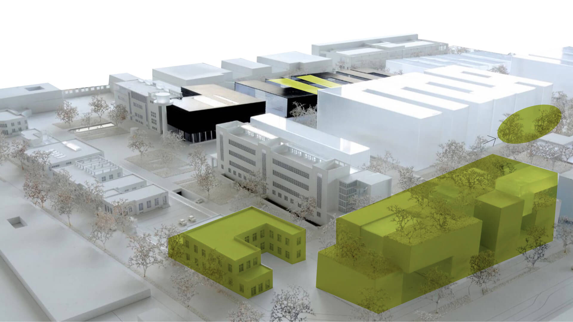 - Bei den Baulosen D2 und D3 handelt es sich um die Baukörper in schwarz in der Mitte der Darstellung mit grünem Streifen am Dach. (Bild: NOI) » [IMG 135 kB]