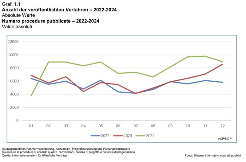 - Die öffentliche Verwaltung in Südtirol hat im vergangenen Jahr deutlich mehr Aufträge vergeben als 2023. Insgesamt wurden 96.536 Verfahren veröffentlicht – ein Plus von 34 Prozent. Der Gesamtwert der vergebenen Aufträge beläuft sich auf 3,82 Milliarden Euro, was einem Anstieg von knapp 80 Prozent entspricht. (Grafik: LPA/Agentur für öffentliche Verträge) » [IMG 117 kB]